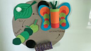 In unserer „Schmetterlingsgruppe“ sind im Juni Tagpfauenaugenraupen eingezogen, die uns einige Wochen begleitet haben und denen wir gemeinsam beim wachsen zusehen konnten. Es war ein tolles Erlebnis für uns, die Raupen zu wunderschönen Schmetterlingen heranwachsen zu sehen. Sie hatten großen Hunger und wir haben sie regelmäßig mit frischen Brennesseln versorgt und gründlich beobachtet. Wir haben viel über unsere neuen Mitbewohner gelernt und es war unser gemeinsamer Wunsch etwas für unsere einheimischen Schmetterlinge zu tun.