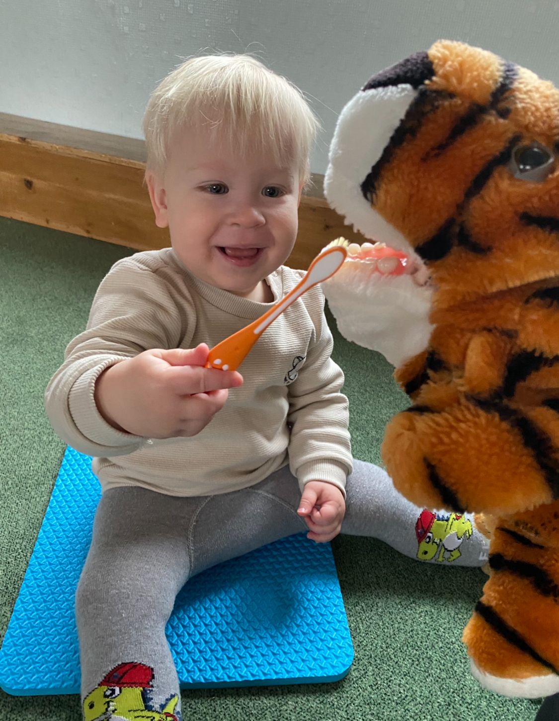 Regelmäßig beschäftigen sich die Kinder mit dem wichtigen Thema „Gesundheit“. Manchmal geht es um gesunde Ernährung, mal um die Hygiene im Allgemeinen und am 03. und 04.06.2025 ging es mal wieder um unsere Zähne. Dazu bekamen wir Besuch von der Zahnschwester. Sie hatte eine tolle Geschichte über das Zähneputzen und ihr Pferd Holly mit dabei. Sie zeigte die richtige Putztechnik und erklärte allen Kindern noch einmal ganz genau, wie wichtig es ist, sich jeden Tag gründlich und richtig seine Zähne zu putzen. Wer ganz mutig war, der durfte sogar dem Pferd Holly mit der supergroßen Zahnbürste die Beißerchen putzen. Das war natürlich ein Riesenspaß! Also: Immer dran denken: „Zähneputzen ist sehr wichtig, darum putzen wir sie tüchtig!“