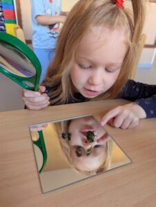 Von Mai bis August wurde es ganz wimmelig und krabbelig bei den Bussi Bären. Unser großes Hausprojekt in diesem Jahr, holte die Insekten in unsere Räume und hinein in unsere Welt. Ihre bunten Farben und verschiedenen Formen luden uns zum Staunen und Entdecken ein. Es gab so viel Interessantes über diese kleinen, wertvollen Tierchen zu erfahren. Es gibt bis zu 80 Millionen Insektenarten auf der ganzen Welt und einige von ihnen haben wir in verschiedenen Projekten kennengelernt. Von der Raupe zum wunderschönen Schmetterling, Lieder und Bücher, große und kleine Insekten-Modelle, Insekten-Puzzle oder Memory, Schattenspiele mit Insekten – es gab so viele spannende Angebote zum Mitmachen und Erleben. Wir waren mit großen Lupen draußen in der Natur unterwegs, um die Insekten ganz aus der Nähe zu betrachten. Wir haben Blumenwiesen angepflanzt und Bienen-Hotels gebaut, damit sie einen Platz zum Nisten haben. Vielleicht haben wir ja Glück und die ersten Bienen ziehen schon bald bei uns ein. Die Welt der Insekten – ein spannendes Naturprojekt!