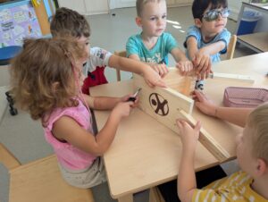 Seit Juli haben unsere Kinder wieder die Möglichkeit ihre handwerklichen Fähigkeiten in der Holzwerkstatt zu schulen und unter Beweis zu stellen. Die Gruppen vereinbaren mit unserem Hausmeister Herrn Wöpe, der die Werkstatt als Fachmann betreut, einen Termin. Während dieser Handwerkerausflüge lernen die Kinder viel über den Werkstoff Holz, seine Beschaffenheit, die Art der Bearbeitung und seinen Wert als natürlichen Rohstoff. Sie lernen den Arbeitsplatz und die verschiedenen Werkzeuge kennen und üben sich in deren Gebrauch.