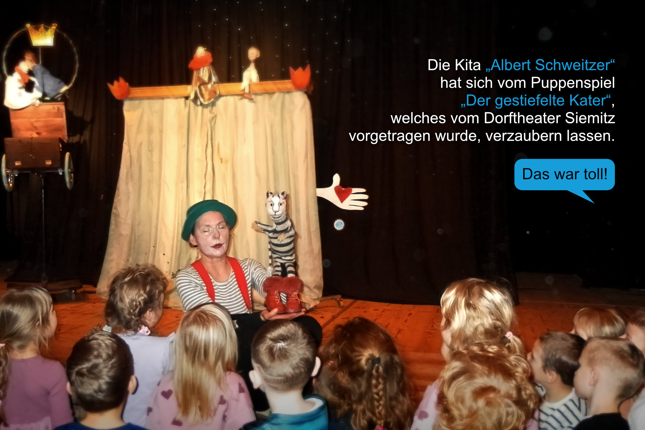 Die Kita Albert Schweitzer ließ sich vom Puppenspiel „Der gestiefelte Kater“ verzaubern, aufgeführt vom Dorftheater Siemitz. Gebanntes Zuschauen, große Augen und ganz viel Begeisterung – das war toll!